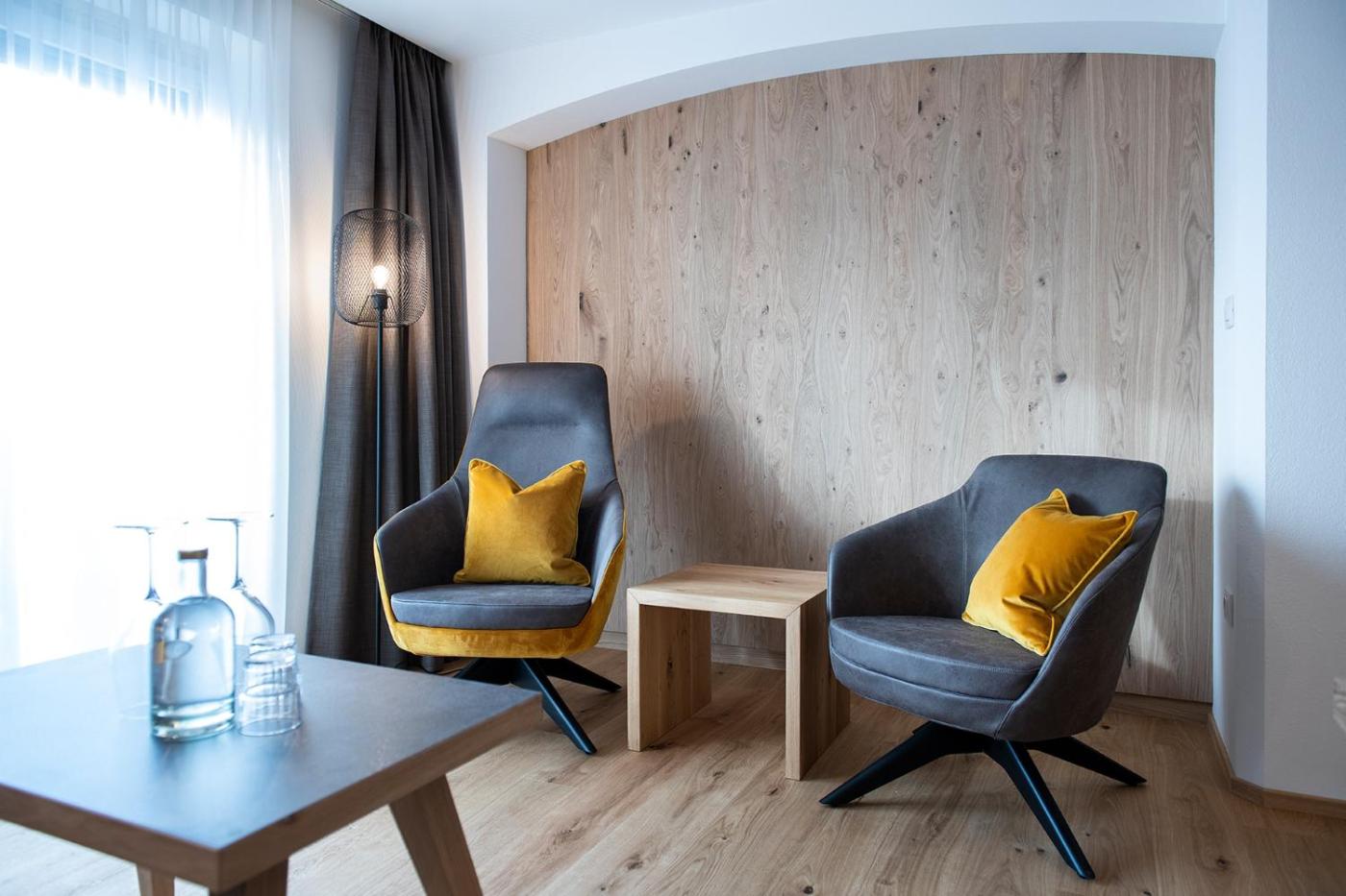 Suite with Hot Tub. Modern suite with alpine-style furnishings and a balcony with a view of the mountains. Has parquet floors and a private bathroom with shower and bathtub. ;